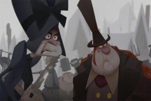 I applaud the film for choosing one male and one female as the primary antagonist characters. Mrs. Tammy Krum (voiced by the fabulous Joan Cusack) heads the Krum clan, while Mr. Aksel Ellingboe (Will Sasso) leads the Ellingboes. Their two children, Pumpkin Krum (voiced by the film’s writer and director, Sergio Pablos) and the Ellingboe boy (Evan Agos) end up together at the end of the film, Pumpkin declaring him “mine” after the Ellingboe boy saves her. Yet, at the beginning of the film, the entire town sides with one clan or the other, fighting constantly and playing cruel pranks on another daily. By the end, the marriage of the Krum and Ellingboe children almost seems inevitable, pulling together these two opposites (yes, another dichotomy).